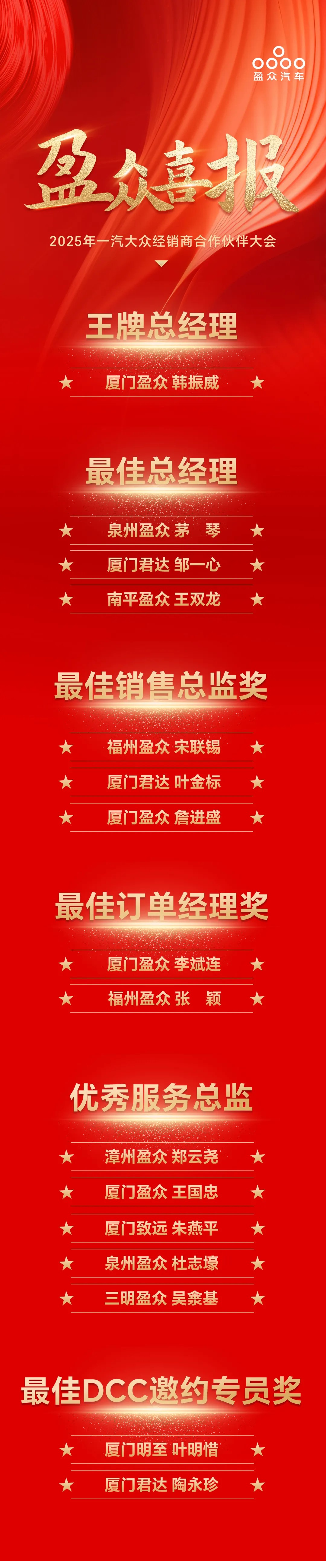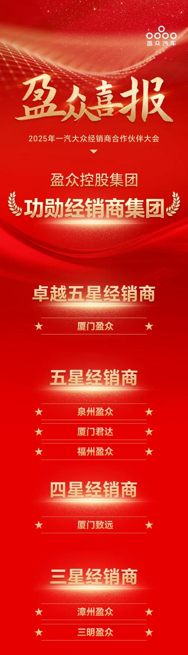 喜報(bào) | 盈眾榮獲2024年度一汽-大眾功勛經(jīng)銷商集團(tuán)、卓越五星經(jīng)銷商、五星經(jīng)銷商、王牌總經(jīng)理等多項(xiàng)大獎(jiǎng)